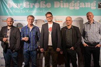 Gunnar Homann, Robert Koall, Philip Saß, Stefan Pölt und Àxel Sanjosé stritten vorbildlich und auf höchstem komischen Niveau um den Preis für Komische Lyrik.